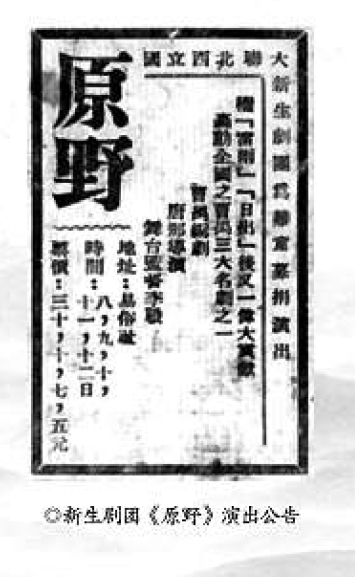 新生剧团《原野》演出公告 图片选自《西北联大文学作品选》