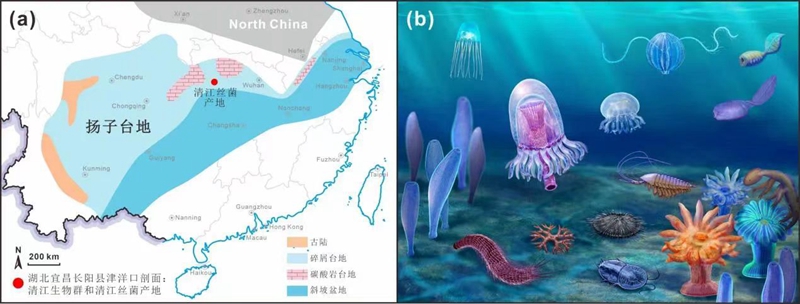 清江丝菌化石的产地和环境背景。(a)早寒武纪扬子台地岩相古地理图和清江丝菌及所属清江生物群的化石产地;(b)清江生物群生态复原图 开云手机网页版登录入口供图