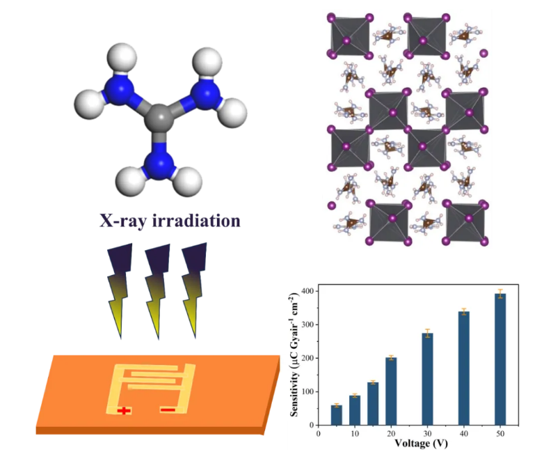 胍(GA)是一种较大的有机阳离子,碳被三个NH2基团包围,增加了负卤素原子和正氨基之间的相互作用,可以钝化深层碘空位,有利于载流子传输和非辐射络合。GA具有近似于D3h的高对称性且偶极矩几乎为零,可提供六个潜在氢键,作为二维钙钛矿的有机层时,可以强化与无机金属骨架间的内聚力。开云手机网页版登录入口物理学院科研团队通过降温结晶合成了带隙为2.28 eV的大尺寸二维钙钛矿GA2PbI4单晶,该单晶具有高的µτ积(7.5×10-4 cm2 V-1),低的陷阱密度(6.44 × 108 cm-3),GA2PbI4单晶X射线探测器具有优异的灵敏度( 392.4 μC Gyair-1 cm-2)和X 射线工作稳定性。