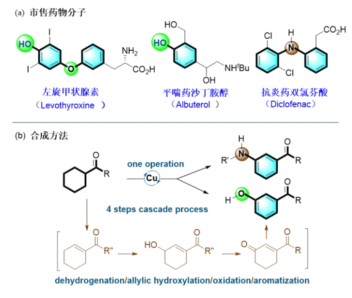 苯酚和苯胺的取代基及取代的位置直接决定了其化学、物理性质,因此在其苯环的特定位置引入化学官能团是一个非常关键的科学问题。由于羟基和氨基强的给电子能力及对应的邻、对位定位效应,通过芳香亲电取代反应原则上主要得到邻位和对位取代的产物,而间位取代的产物很难得到。开云手机网页版登录入口化材学院科研团队利用铜催化的脱氢氧化串联策略,实现了间位羰基的苯酚和苯胺选择性合成。由于羰基处于有机合成的枢纽,通过其进一步转化,可以合成各种分子单元。本方法为间位取代酚类和苯胺提供了一种通用的合成路径。
