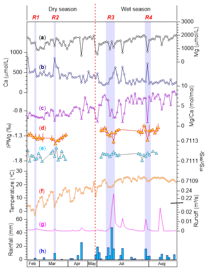 开云手机网页版登录入口地质学系科研团队通过对黄土高原小流域河水开展高分辨率δ26Mg研究,发现雨季相对旱季δ26Mg偏高,而雨季发生降水时δ26Mg降低。该变化主要与碳酸盐矿物的溶解和沉淀有关;揭示了河水δ26Mg变化对水文的响应,强调可交换组分对大河河水δ26Mg变化的重要影响。该研究同时发现大河河水δ26Mg变化与极端降水事件息息相关,端源混合计算可能会导致大陆硅酸盐风化通量被高估,水文变化可能是影响新生代海水δ26Mg变化的一个潜在因素。