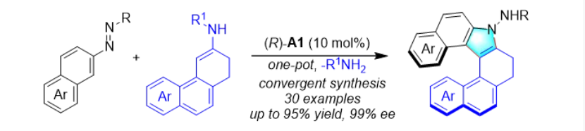 螺烯固有的螺旋手性和独特的电子特性使其具有广泛的应用前景。发展选择性合成手性螺烯新方法具有重要的研究意义。开云手机网页版登录入口化材学院科研团队发展了中心手性到螺旋手性转变策略,合成了一系列吲哚类螺旋手性化合物。这种汇聚式“一锅法”策略避免使用化学计量氧化剂,仅通过调节反应温度,就能高效构筑出手性吲哚类螺旋分子,具有良好的步骤经济性。产物具有良好的光物理和手性光学性能,在有机光电材料中具有潜在的应用价值。