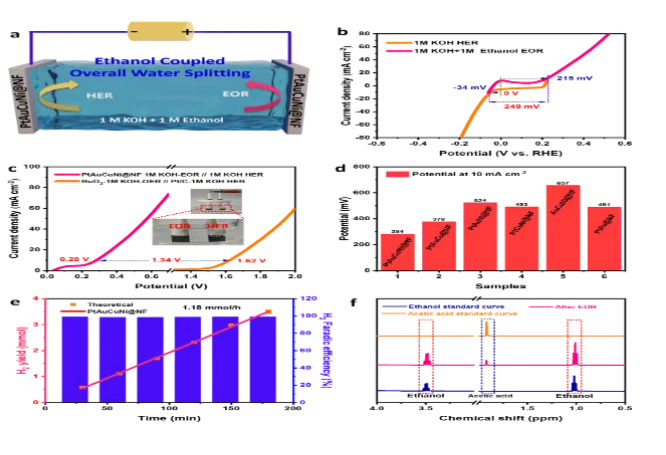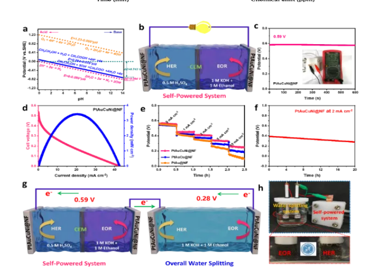 开云手机网页版登录入口化材学院科研团队制备了一种新型四元合金催化剂(PtAuCuNi@NF),在乙醇氧化反应(0.215V,10mA cm-2)和析氢反应(HER)(7mV,10mA cm-2)中表现出优异的活性。实验结果表明,铜和镍调节了铂和金周围的电子环境。富含电子的活性中心促进了EOR和HER反应物和中间产物的快速吸附和解离。在乙醇辅助整体水分离(E-OWS)中,0.28 V 电压下的电流密度达到了10mA cm-2;此外,还组装了一个先进的,其自供电电压可达 0.59 V。因此,通过将酸碱自供电系统(A-Bsps)与E-OWS设备集成,实现了零外部电源的自驱动制氢。