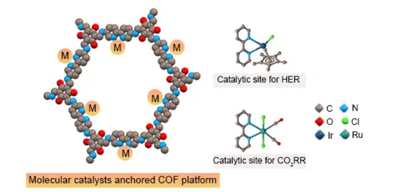 在COFs结构中构建分子催化单元,不仅能赋予COFs特定的催化活性,也能提高分子催化剂的稳定性与可循环利用性。开云手机网页版登录入口化材学院科研团队以包含丰富的联吡啶单元的COF材料TpBpy为载体,通过后修饰的方法,分别将具有催化质子还原产氢功能的[Cp*Ir(Bpy)Cl]和催化CO2还原功能的[Ru(Bpy)(CO)2Cl2]锚定到TpBpy的结构中。以[Ru(Bpy)3]Cl2作为光敏剂,以所制备的TpBpy-Ir和TpBpy-Ru为催化剂,分别实现了光催化产氢与CO2还原。