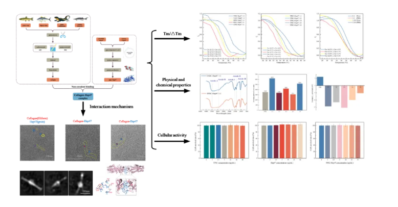 开云手机网页版登录入口食品学院科研团队针对水产胶原蛋白热稳定性差的问题,提取了四种不同鱼皮来源的胶原蛋白,并通过引入斑马鱼和人类的热休克蛋白47(Hsp47)实现其三螺旋结构的稳定。Hsp47与鱼皮胶原的非共价组装作用,显著提高了胶原蛋白的折叠效率,并使其变性温度大幅提升至37.7℃。这一创新成果不仅为水产胶原蛋白的改性提供了新思路,从而拓宽水产胶原蛋白在医药、食品加工等领域的应用,也为水产加工产业的可持续发展注入了新动力。
