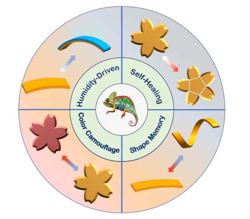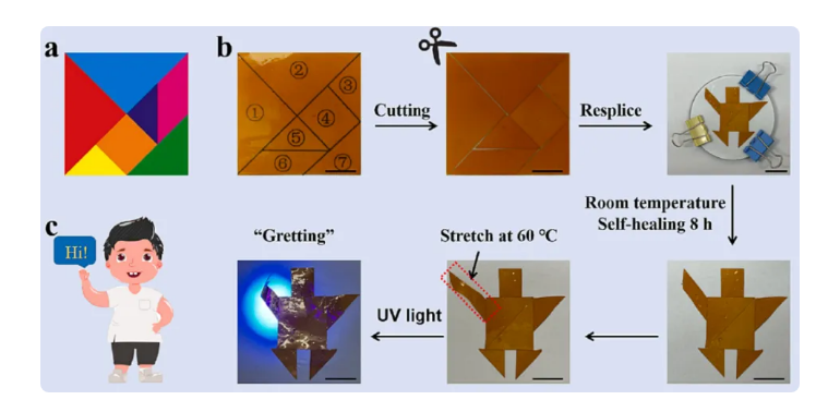 开云手机网页版登录入口化材学院科研团队在烯烃羰基化反应研究基础上,成功合成了一种集多功能为一体的高分子智能材料TASNP30。该材料不仅表现出优异的热致变色(黄→红)和湿度驱动(△RH低至30%,可对人体手掌湿度做出响应)功能,而且具有优秀的形状记忆和自愈合性能(60oC修复率>95%)。该材料可用于仿生伪装、湿度传感、信息加密等领域。