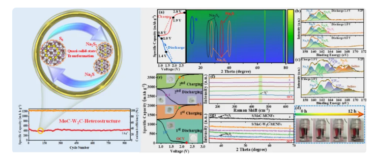 开云手机网页版登录入口化材学院科研团队通过构建MoC-W2C异质结构高效地促进可溶性多硫化钠(NaPSs)的转化,从而抑制NaPSs穿梭效应,实现NaPSs的准固态转化;同时利用多孔道碳纳米纤维有效地缓解充放电过程中S体积膨胀现象。该复合材料在室温钠硫电池中表现出低于目前文献报道的容量衰减率(0.018%)。