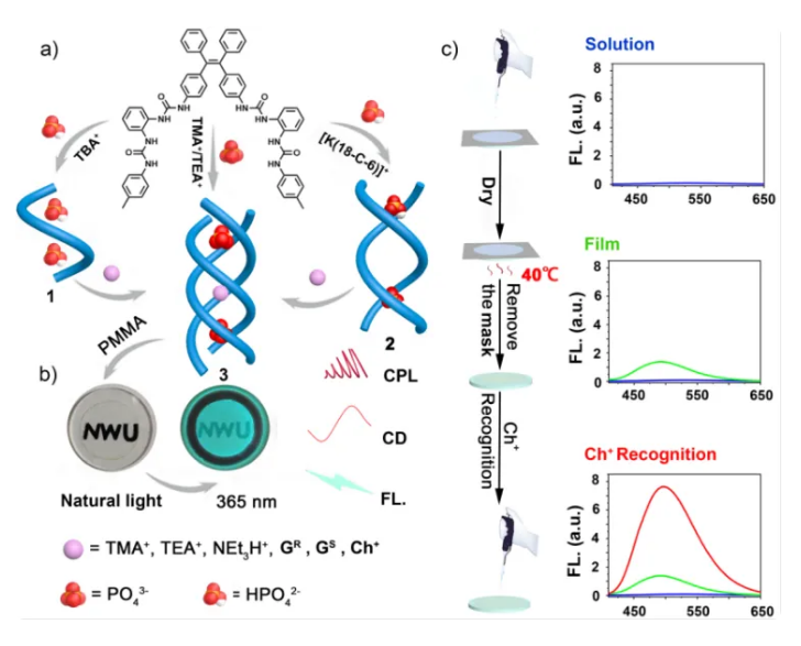 离散超分子结构的功能薄膜材料在传感、储能、催化等研究领域具有潜在的应用前景。开云手机网页版登录入口化材学院科研团队以阴离子配位组装体为基础,结合聚甲基丙烯酸甲酯(PMMA)合成了具有荧光、CD和CPL性质的功能薄膜。通过该策略合成的包含阴离子配位三股螺旋结构的薄膜,克服了阴离子配位自组装体在水中溶解度和稳定性差的问题,实现了水相生物分子(胆碱及胆碱衍生物)的识别,为设计和合成用于水相检测生物分子的功能材料提供了一种简单且通用的方法。