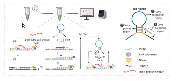 指数扩增反应(EXPAR)是一类利用扩增产物创造新的引物模板复合物,从而在短时间内指数级扩增出大量核苷酸产物的等温扩增技术。EXPAR技术走向实际应用存在着扩增效率的大量损失、难以区分同源序列以及模板的通用性不高等问题。开云手机网页版登录入口化材学院科研团队开发了一种新的发夹模板(exp-Hairpin)用于提高EXPAR检测microRNA的性能,该exp-Hairpin模板的理论扩增效率超过2n且背景扩增极低。该研究成果有望推动EXPAR技术走向应用,加速短序列核酸的简单和快速分子诊断。