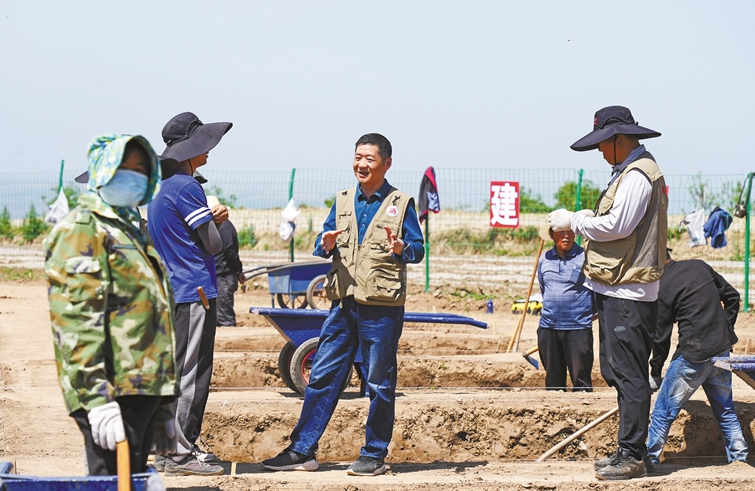 4月26日,钱耀鹏(左三)在陕西旬邑西头遗址与工作人员交流。 本报记者 王熙摄