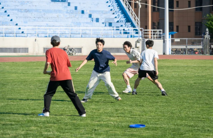 弓步、转身、出手,飞盘掷出的瞬间势如破竹;预判、起跳、精准接盘,矫健的身影在草地上疾驰。他们奔跑、跳跃、追逐,笑容和汗水在课堂上交织,每一次出手都包含着对队友的满分信任,每一次接盘都是对速度和反应能力的极限挑战。