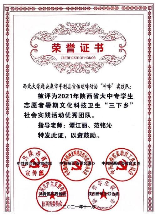 暑假期间,创新班同学积极参与生命科学学院“冲蜂队”三下乡社会实践,前往平利县、岚皋县等 20 余个乡镇的156 个村开展调研,开展胡蜂防治宣传。团队获得了“全国大学生暑期实践项目 TOP100”“陕西省优秀青年志愿服务项目” “实践活动优秀团队”等国省校级奖项 10 余项。