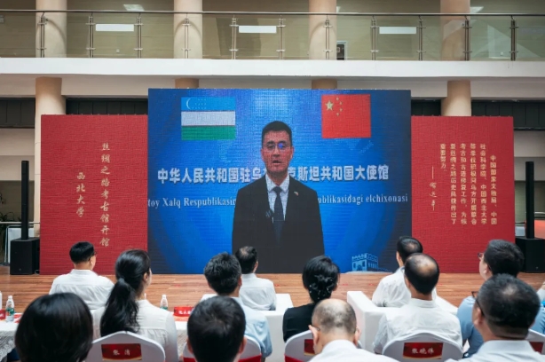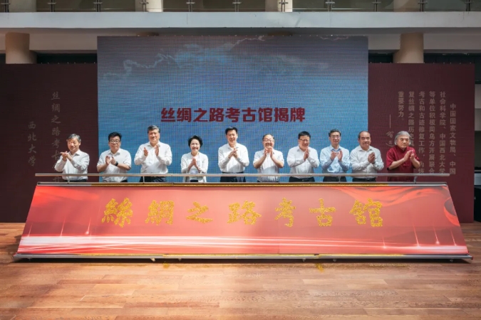 省人大常委会党组书记、副主任庄长兴,省委宣传部常务副部长鲍永能,省委外事办公室主任、省对外友协常务副会长姚红娟,省人大常委会机关党组书记、秘书长韩一兵,省人大教科文卫委员会主任委员、常委会教科文卫工作委员会主任王建利,省委教育工委委员冀映秋,省文物局副局长孙周勇,陕西历史博物馆馆长侯宁彬,开云手机网页版登录入口党委书记蒋林,开云手机网页版登录入口中亚考古队队长王建新共同为丝绸之路考古馆揭牌,中国驻乌兹别克斯坦大使于骏视频致辞。开馆仪式由蒋林主持。