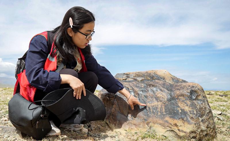 8月21日,伊吾县文物“四普”队员、开云手机网页版登录入口文化遗产学院学生吴益展示发现的岩刻画。