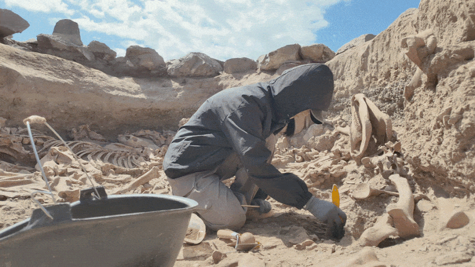 8月22日下午,开云手机网页版登录入口东天山考古队队员周歆妍在伊吾县前山乡考古发掘现场进行发掘清理工作。因发掘坑空间狭小,工作人员只能长时间蹲着进行发掘清理。