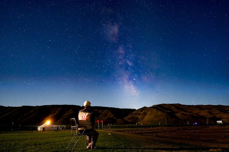8月22日深夜,伊吾县前山乡考古发掘项目守夜人封嘉乐走出毡房,欣赏璀璨星空。