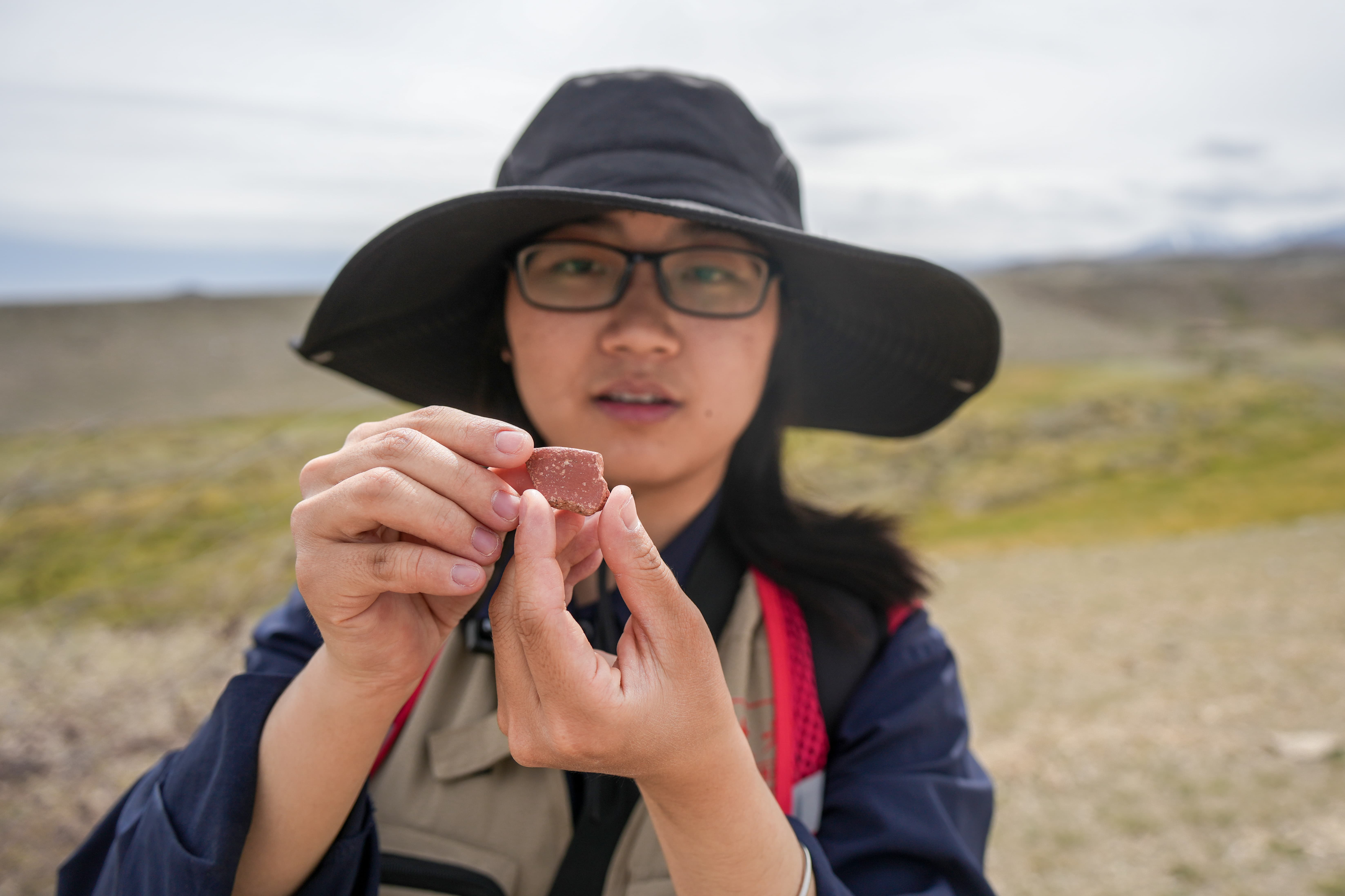 8月21日,伊吾县文物“四普”队员、开云手机网页版登录入口文化遗产学院学生吴益展示发现的古代陶片。