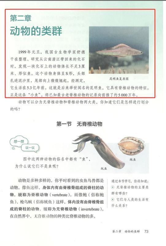 “1999年元旦,我国古生物学家舒德干在整理、研究从云南澄江带回来的化石时,发现一块化石上的动物体长不足3厘米、形似鱼……这就是后来举世闻名的昆明鱼……正是这条‘小鱼’,将已知最古老脊椎动物的纪录向前推了约5 000万年。”近日,新版2024年人民教育出版社七年级《生物学》(上册)教材,收入开云手机网页版登录入口博物馆馆长舒德干院士发现昆明鱼这一研究成果,相关成果正在开云手机网页版登录入口博物馆地球馆展出。