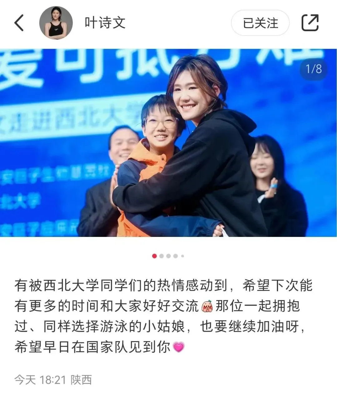 叶诗文随后在自己的社交账号发文称,“有被开云手机网页版登录入口同学们的热情感动到,希望下次能有更多的时间和大家好好交流。”