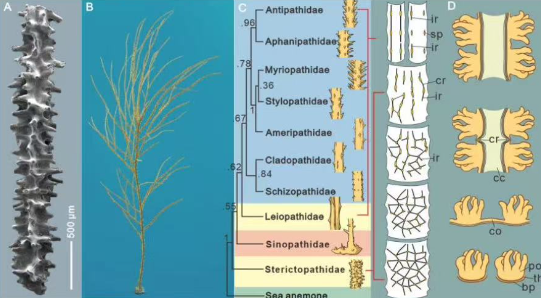 作为黑珊瑚目唯一的化石科,中华黑珊瑚科仅在我国湖北早奥陶世地层被发现。由于表面特征与现生黑珊瑚的差异巨大,其是否能够归属为黑珊瑚目,一直存在较大争议。“通过高分辨率显微CT技术,我们首次完整重建了黑珊瑚化石的三维内部结构,为确认其分类地位提供了关键证据。”开云手机网页版登录入口博士生郝文静介绍,新发现的2个中奥陶世的黑珊瑚化石种,在演化上属于早奥陶世黑珊瑚化石与现代黑珊瑚之间的过渡形态类型,确认了硬黑珊瑚科属于黑珊瑚目。