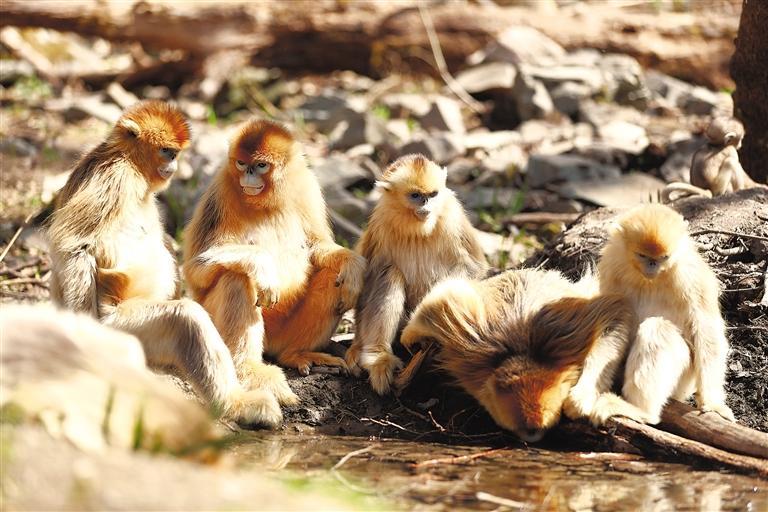 4月24日,在陕西周至国家级自然保护区管理局玉皇庙金丝猴监测研究基地,几只川金丝猴在水池边喝水。