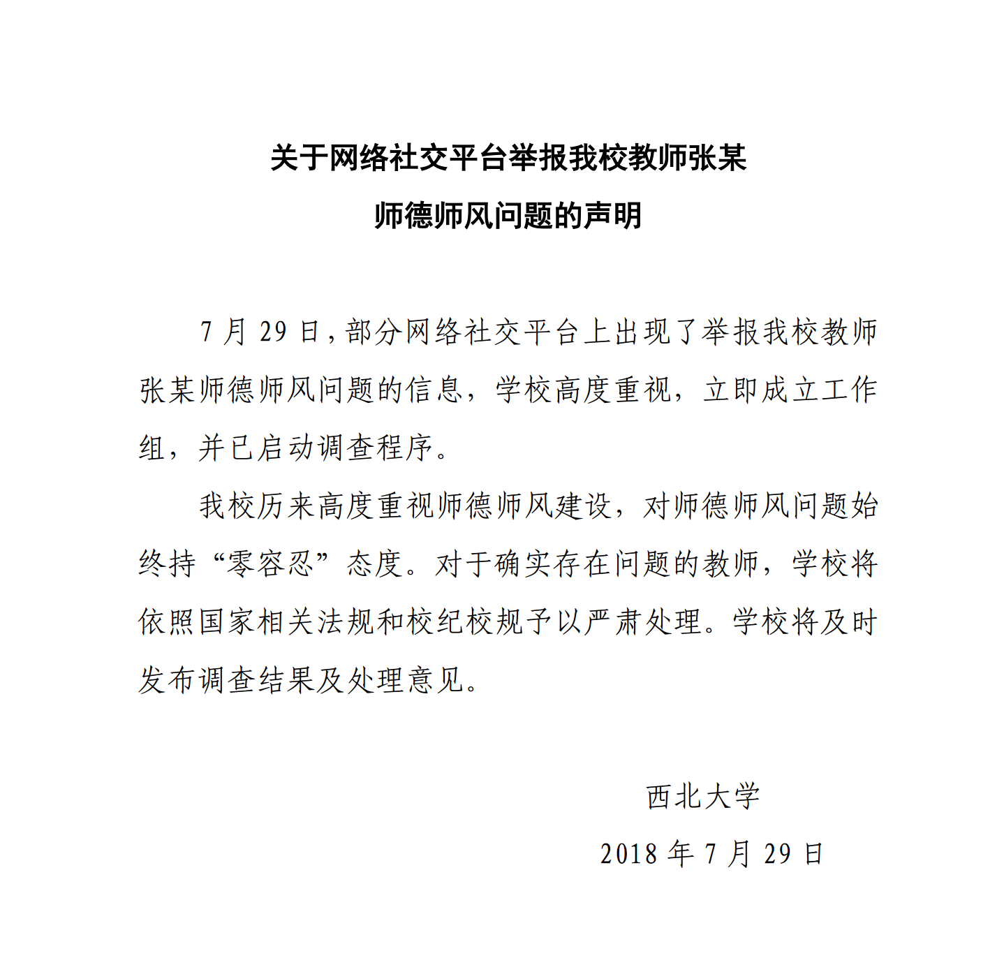 关于网络社交平台举报开云手机网页版登录入口教师张某师德师风问题的声明