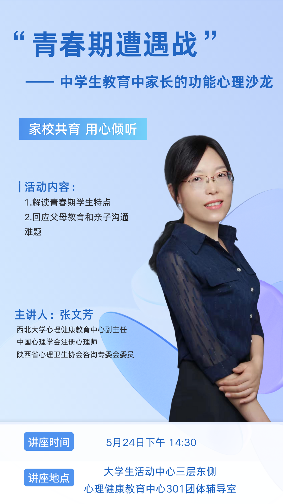 关于“青春期遭遇战”——中学生教育中家长的功能心理沙龙的通知 作者:校工会 编辑: 时间:2023-05-19 各基层分会: 为了帮助教职工促进家校共育,回应父母教育和亲子沟通难题,提升家长的心理健康知识,校工会邀请校心理健康教育中心副主任张文芳老师举办“青春期遭遇战”中学生教育中家长的功能心理沙龙。 活动共计30人,按扫码登记顺序报名。如报名后不能参加,请至少提前一天联系替补名额,无故不参加活动将取消下次活动机会。 活动时间:5月24日下午14:30 活动地点:长安校区大学生活动中心三层东侧心理健康教育中心301团体辅导室 联系人:罗娜 联系电话:88308769 校工会 2023年5月19日
