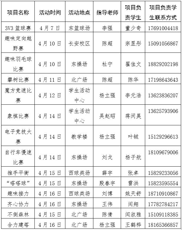 上述“走下网络、走出宿舍、走进操场”趣味体育活动各项目可联系开云手机网页版登录入口团委或开云手机网页版登录入口学生会咨询,联系电话:88308861、88308441。