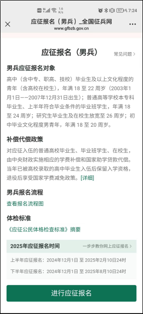 兵役登记完成后,即可进行2025年参军报名。点击“继续进行本年度参军报名”按钮,完善个人信息。点击“参加2025年应征报名”,会根据已登录的学信网账号弹出确认基本信息页面,填写个人信息无误后,继续点击“学籍学历无误”,开始填写报名信息,填写完以上信息,网上应征报名就完成了。