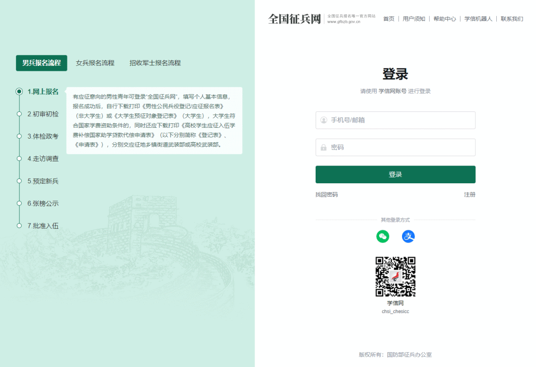 注意:①注册学信网账号必须实名,一定要认真填写真实姓名和身份证,兵役机关将对信息进行审核。注册时使用的手机号即是账号,请牢记账号和密码。