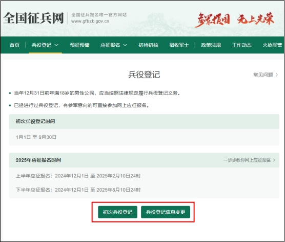 在这个页面中,点击“初次兵役登记”或“兵役登记信息变更”。
