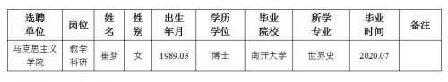 经用人单位及教学督导考核、学校研究,拟同意选聘下列人员来校工作,其聘任关系为A类人事代理。本着公平、公正、公开的原则,现将拟选聘人员基本情况公示如下:
