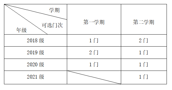 1. 根据学校教学计划安排和教学资源设置情况,在选课门次上,一年级新生第一学期暂不修读通识教育选修课程,第二学期每人限选1门、二年级学生每人每学期限选1门、三年级和四年级学生可在上下两学期交错选课1-2门。具体可选课门次如下表所示: