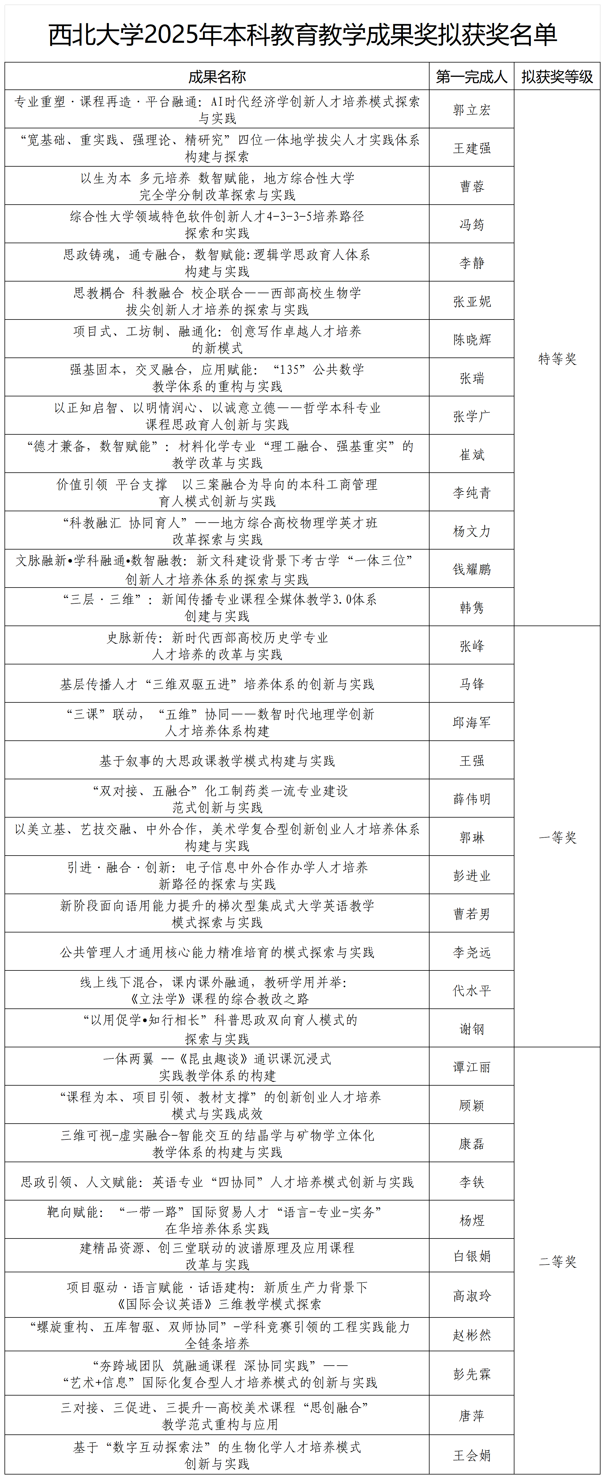 根据《开云手机网页版登录入口关于开展2025年本科教育教学成果奖评选工作的通知》(西大教〔2025〕19号)要求,经个人申报、单位推荐与专家评审,拟确定“专业重塑·课程再造·平台融通:AI时代经济学创新人才培养模式探索与实践”等14项成果获特等奖,“史脉新传:新时代西部高校历史学专业人才培养的改革与实践”等11项成果获一等奖,“一体两翼-《昆虫趣谈》通识课沉浸式实践教学体系构建”等11项成果获二等奖。同时,将依序推荐参加陕西省2025年本科教育教学成果奖评选。现将拟获奖名单予以公示,公示期为2025年9月8日-12日。公示期任何单位或个人有异议,请实名以书面形式向教务处反映。