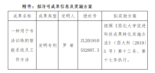 按照《开云手机网页版登录入口促进科技成果转化实施办法》(西大科〔2019〕5号)相关规定,拟对开云手机网页版登录入口艺术学院罗希老师作为成果负责人的1项发明专利权实施普通许可,现将相关信息公示如下: