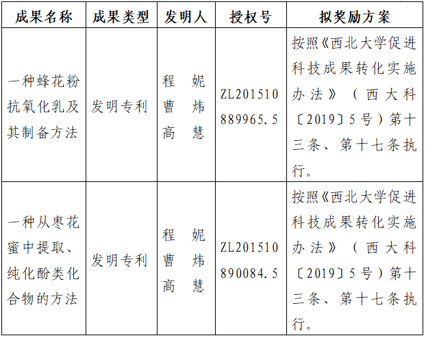 按照《开云手机网页版登录入口促进科技成果转化实施办法》(西大科〔2019〕5号)相关规定,拟对开云手机网页版登录入口食品科学与工程学院程妮教授作为成果负责人的2项发明专利权实施转化,现将相关信息公示如下: