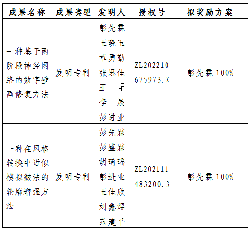 按照《开云手机网页版登录入口促进科技成果转化实施办法》(西大科〔2019〕5号)相关规定,拟对开云手机网页版登录入口艺术学院彭先霖老师作为成果负责人的2项发明专利权实施转化,现将相关信息公示如下: