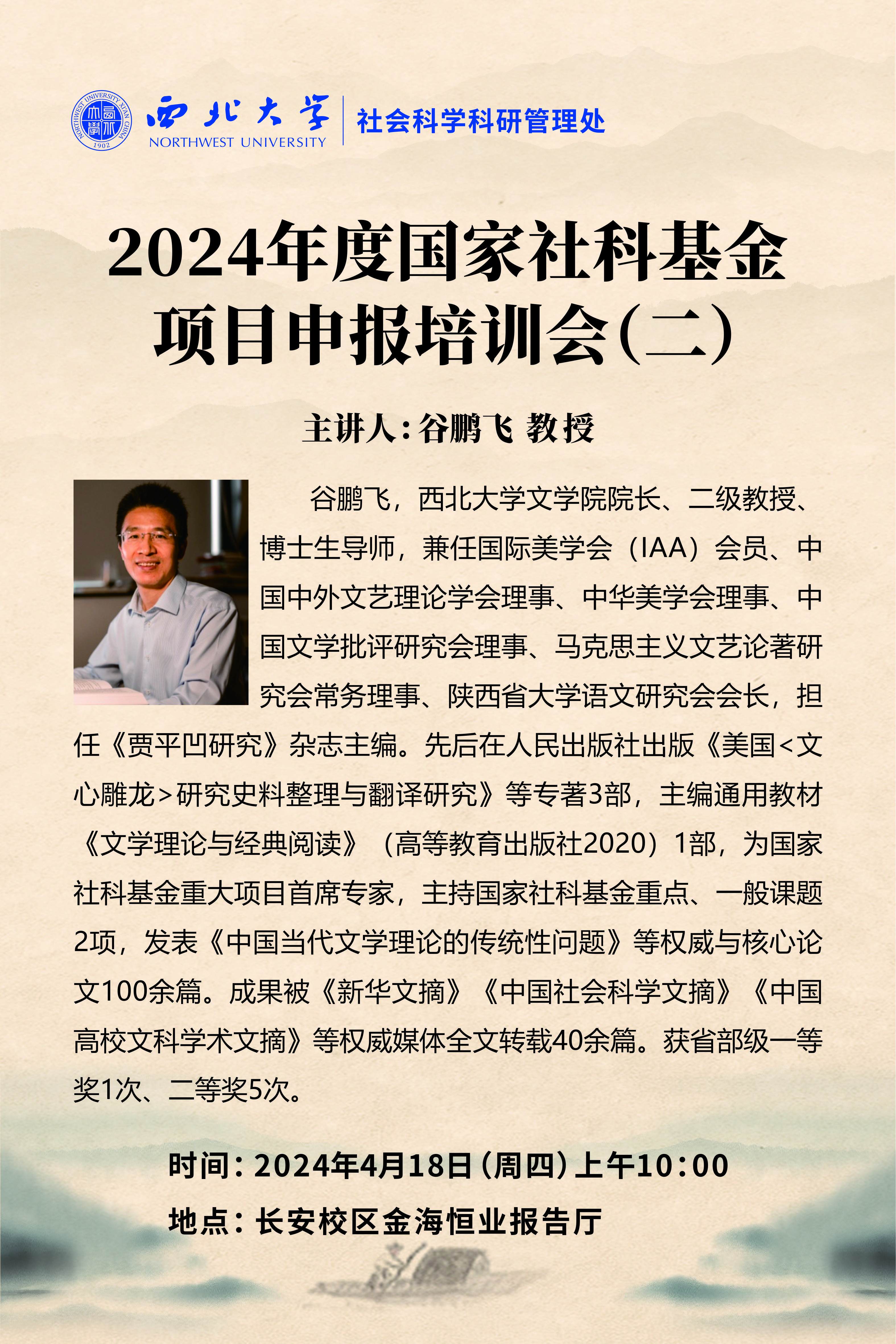 关于召开2024年度国家社科基金项目申报培训会的通知 作者: 编辑:黄心一 时间:2024-04-16 时间:2024年4月18日(周四) 地点:长安校区金海恒业报告厅 参会人员:2024年度国家社科基金项目申请人
