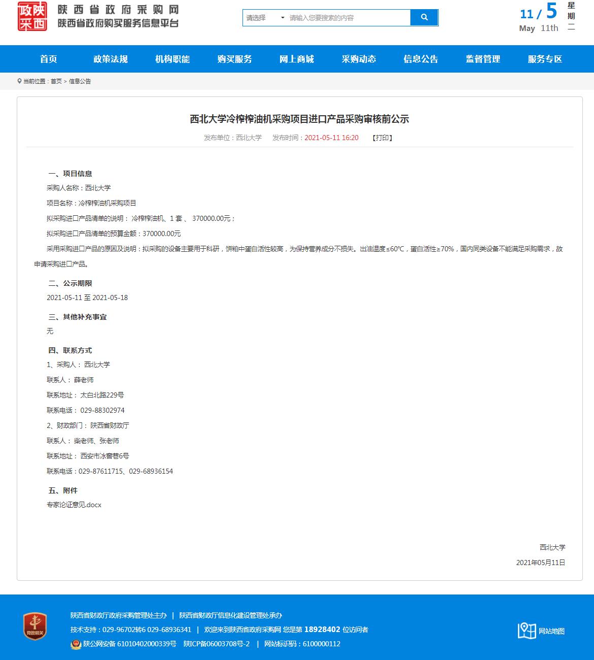 开云手机网页版登录入口冷榨榨油机采购项目进口产品采购审核前公示