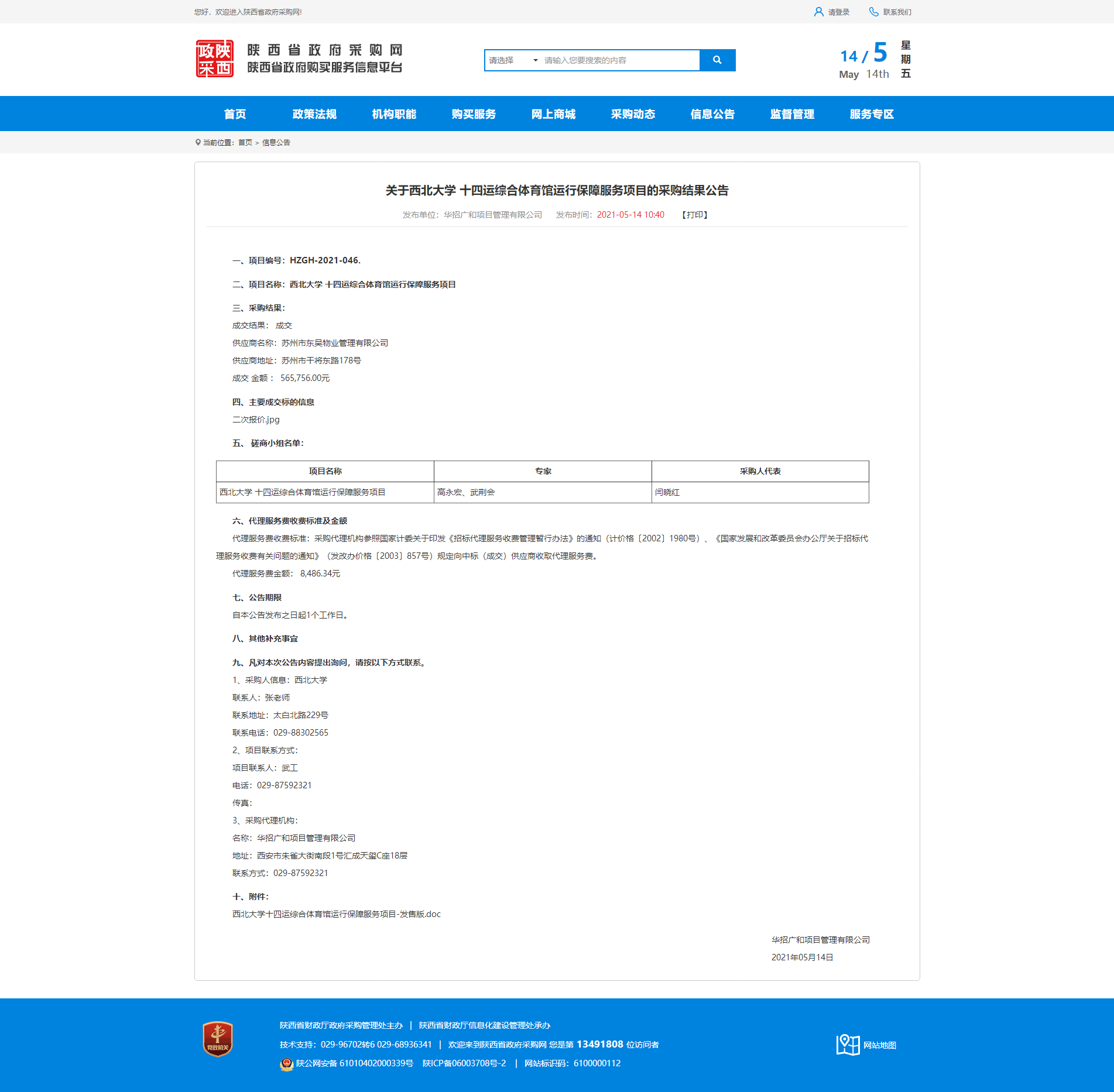 关于开云手机网页版登录入口十四运综合体育馆运行保障服务项目的采购结果公告