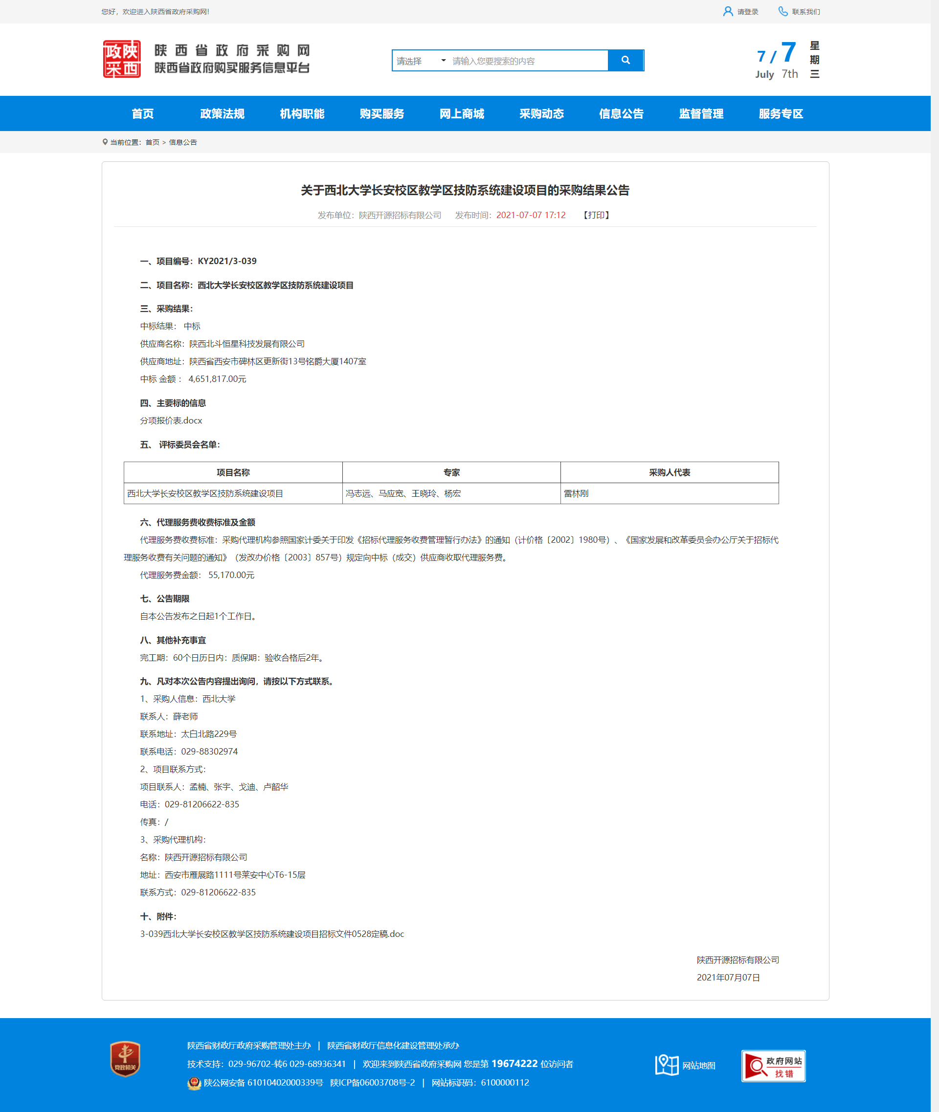 关于开云手机网页版登录入口长安校区教学区技防系统建设项目的采购结果公告 作者: 编辑:采购与招标办公室 时间:2021-07-07 原公告地址:http://www.ccgp-shaanxi.gov.cn/notice/noticeDetail.do?noticeguid=8a85be337a79620e017a7fff10cb41ef