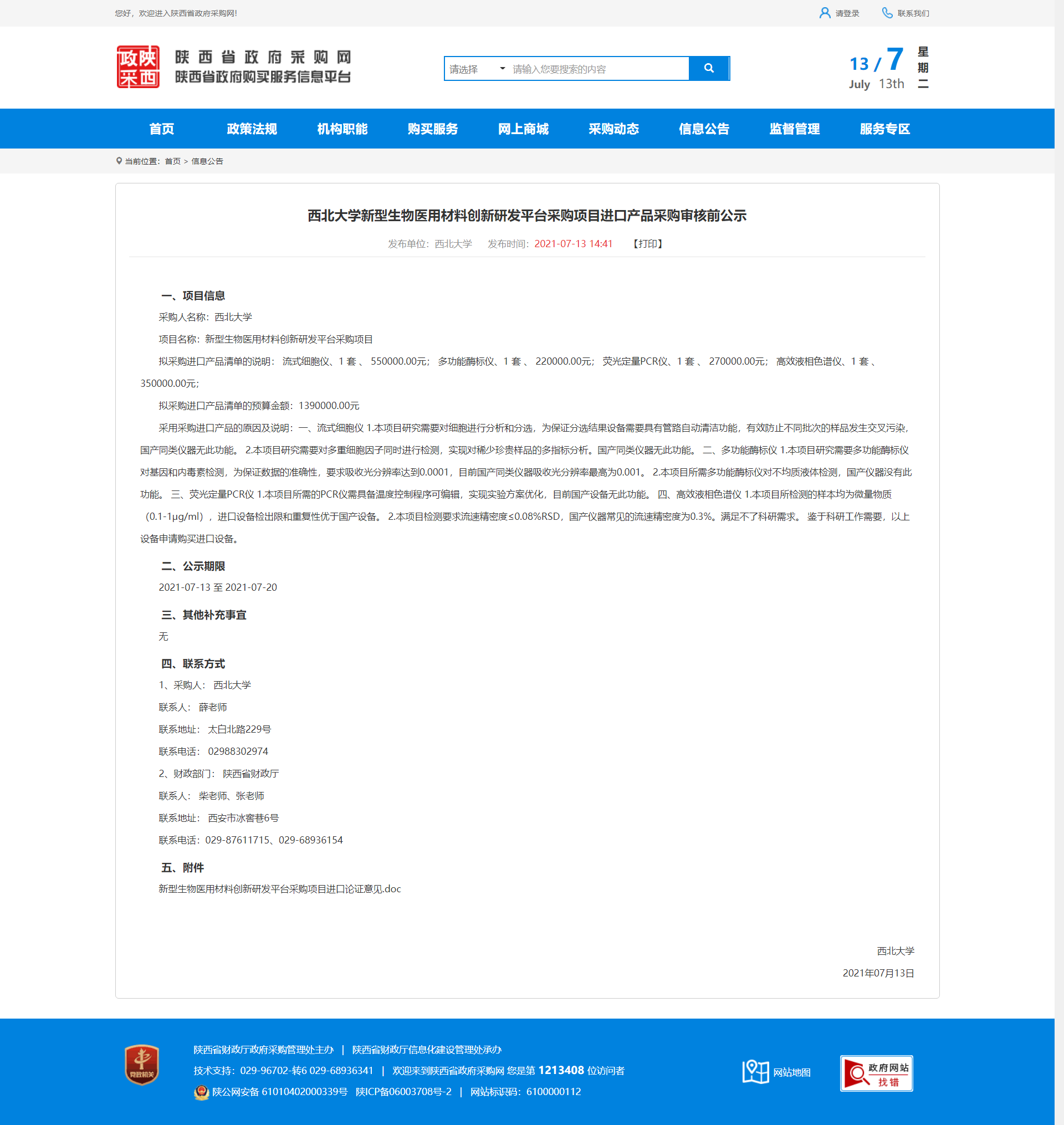 开云手机网页版登录入口新型生物医用材料创新研发平台采购项目进口产品采购审核前公示 作者: 编辑:采购与招标办公室 时间:2021-07-13 原公示地址:http://www.ccgp-shaanxi.gov.cn/notice/noticeDetail.do?noticeguid=8a85be317a79693c017a9e7fb1b57286