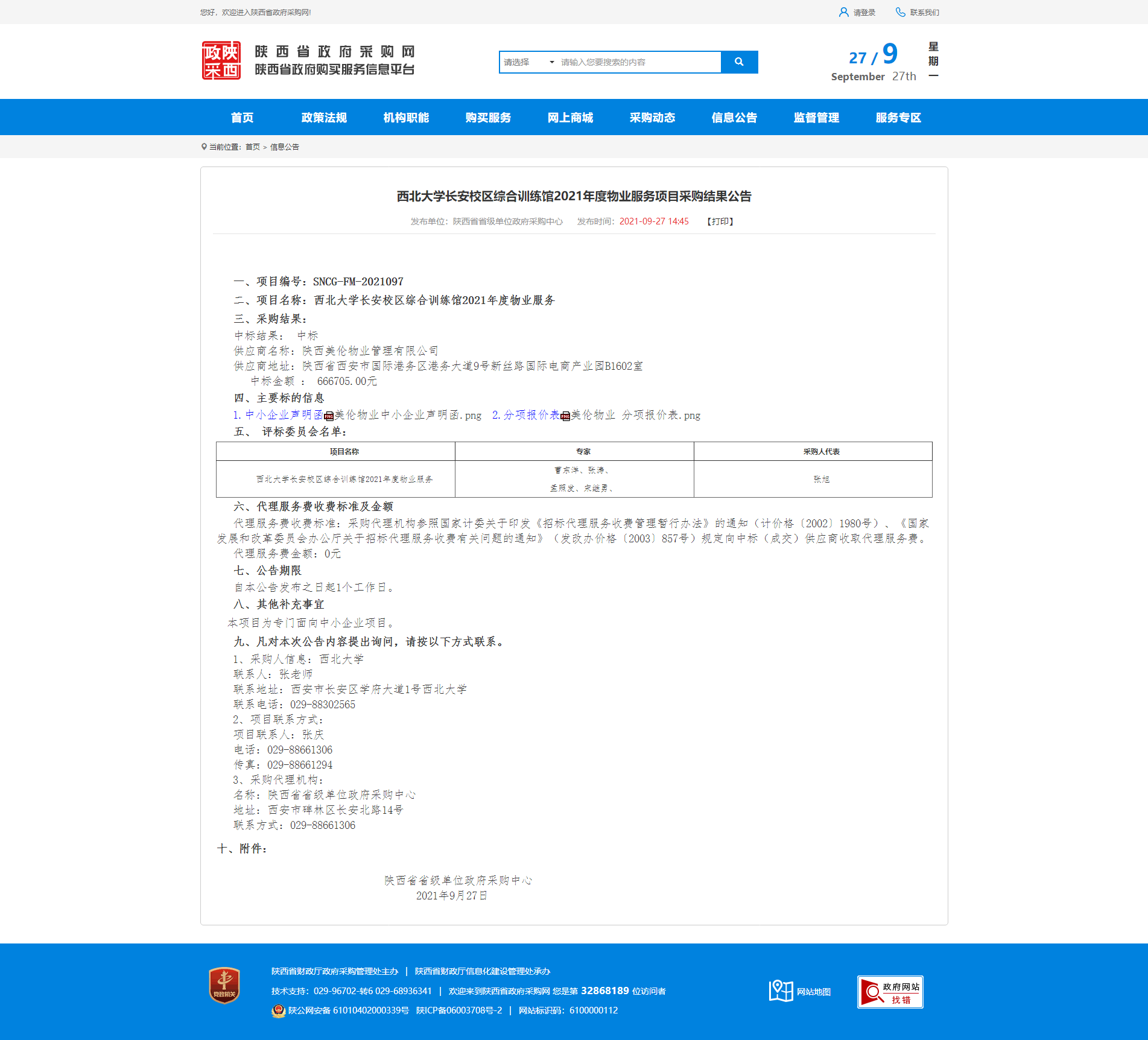 关于开云手机网页版登录入口长安校区综合训练馆2021年度物业服务项目采购结果公告