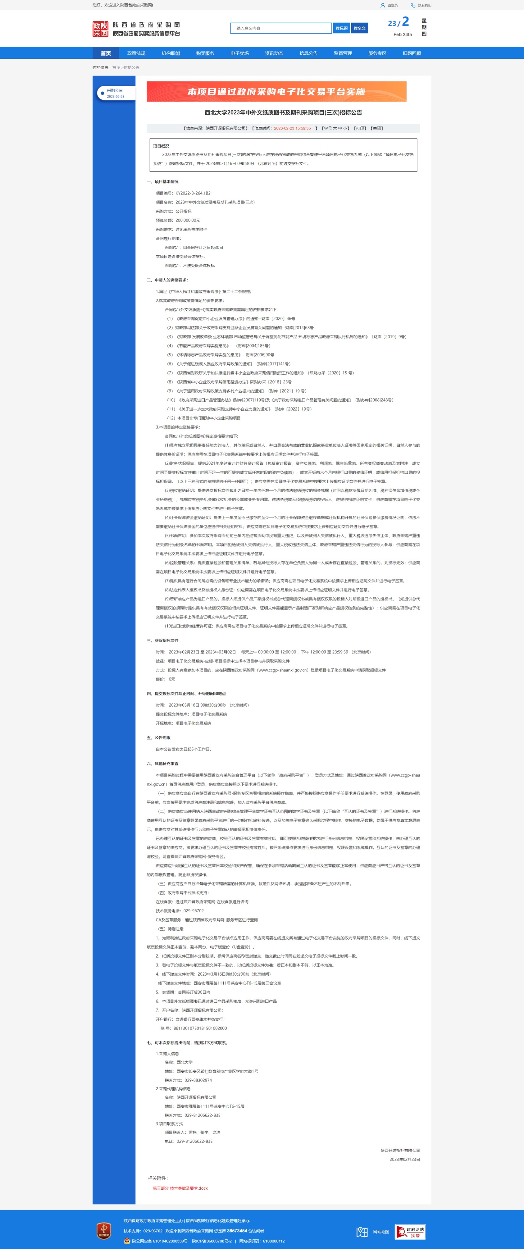开云手机网页版登录入口2023年中外文纸质图书及期刊采购项目(三次)招标公告 作者: 编辑:采购与招标办公室 时间:2023-02-23 原公告链接:http://www.ccgp-shaanxi.gov.cn/freecms/site/shaanxi/ggxx/info/2023/8a69c672865ced8c01867d3e22983dee.html?noticeType=001011¬iceId=de2454c9-b350-11ed-9a8e-08c0eb20c666