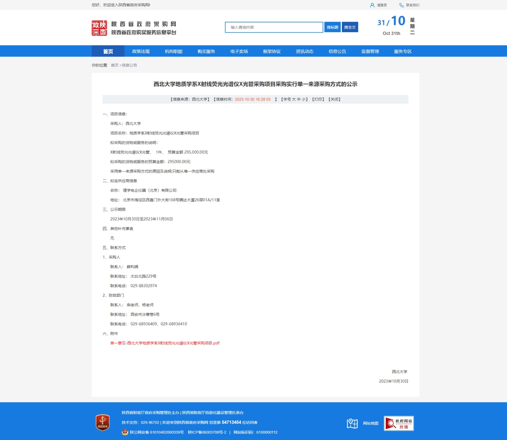 开云手机网页版登录入口地质学系X射线荧光光谱仪X光管采购项目采购实行单一来源采购方式的公示 作者: 编辑:采购与招标办公室 时间:2023-10-31 原公告链接:http://www.ccgp-shaanxi.gov.cn/freecms/site/shaanxi/ggxx/info/2023/8a69c9798b7366a8018b7fabb9f2065e.html?noticeType=001051¬iceId=8d5cb875-76ff-11ee-9a8e-08c0eb20c666