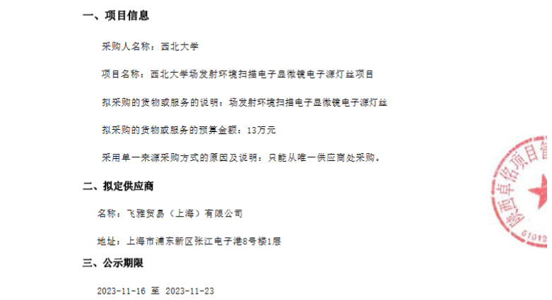 开云手机网页版登录入口场发射环境扫描电子显微镜电子源灯丝项目单一来源采购征求意见公示 作者: 编辑:采购与招标办公室 时间:2023-11-16 原公告链接:http://www.sntba.com/website/gg_show.aspx?id=260702