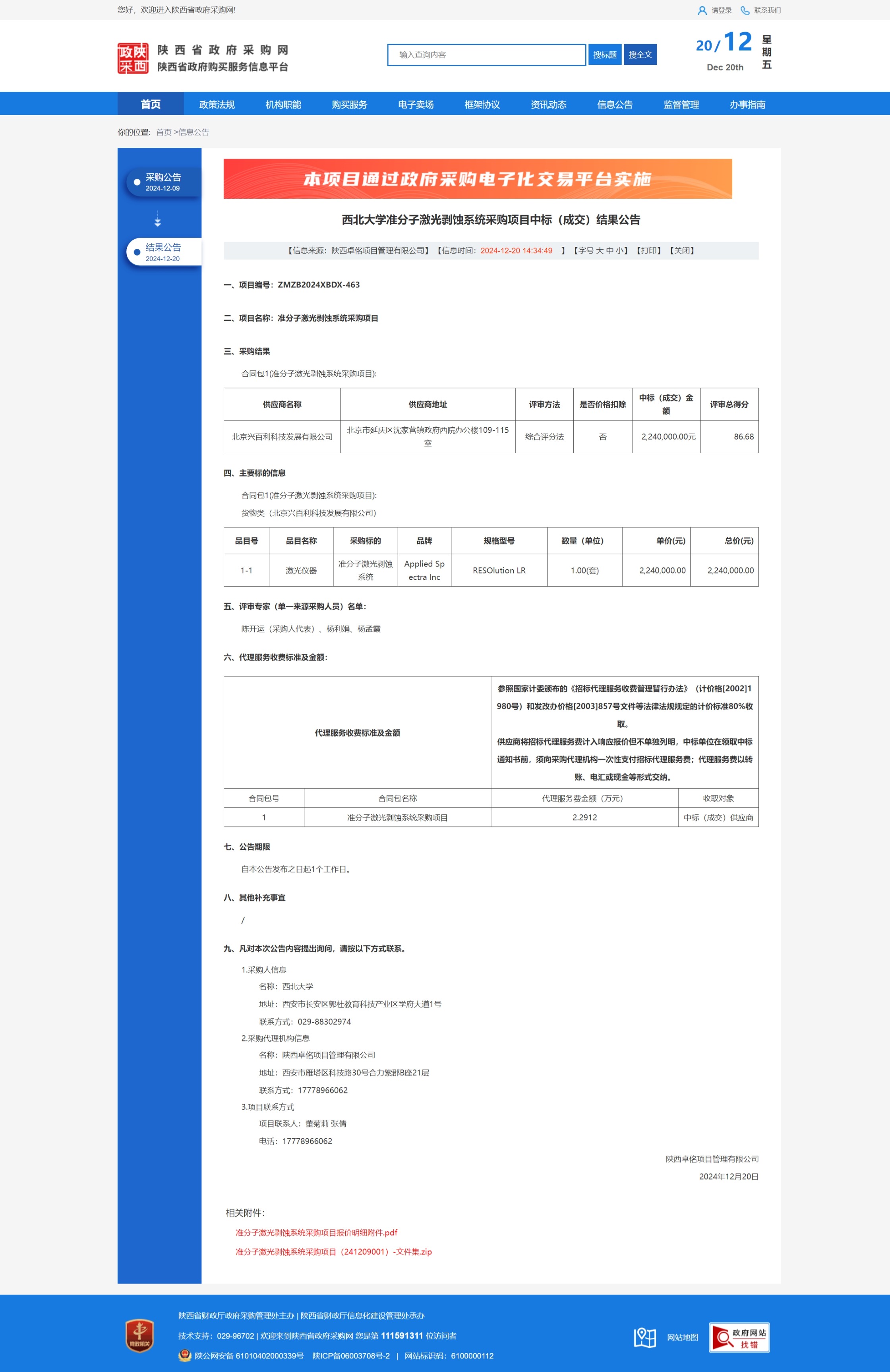 开云手机网页版登录入口准分子激光剥蚀系统采购项目中标(成交)结果公告 作者: 编辑:薛利娟 时间:2024-12-20 原 原公告链接:https://www.ccgp-shaanxi.gov.cn/freecms/site/shaanxi/ggxx/info/2024/8a69c44e9218572b0193e29f87ef1ad0.html?noticeType=001026¬iceId=25ebb152-be9e-11ef-8063-08c0eb20c666