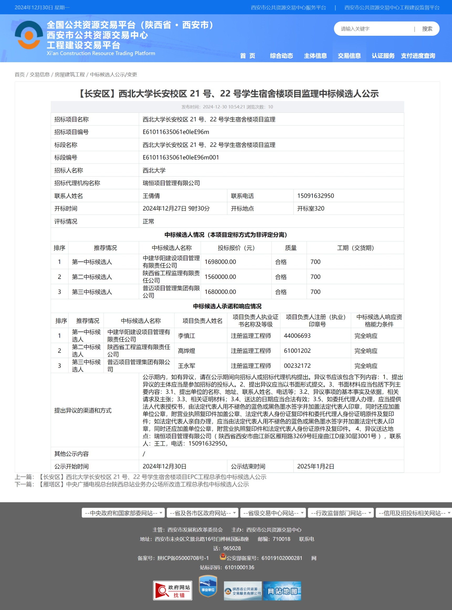 开云手机网页版登录入口长安校区 21 号、22 号学生宿舍楼项目监理中标候选人公示