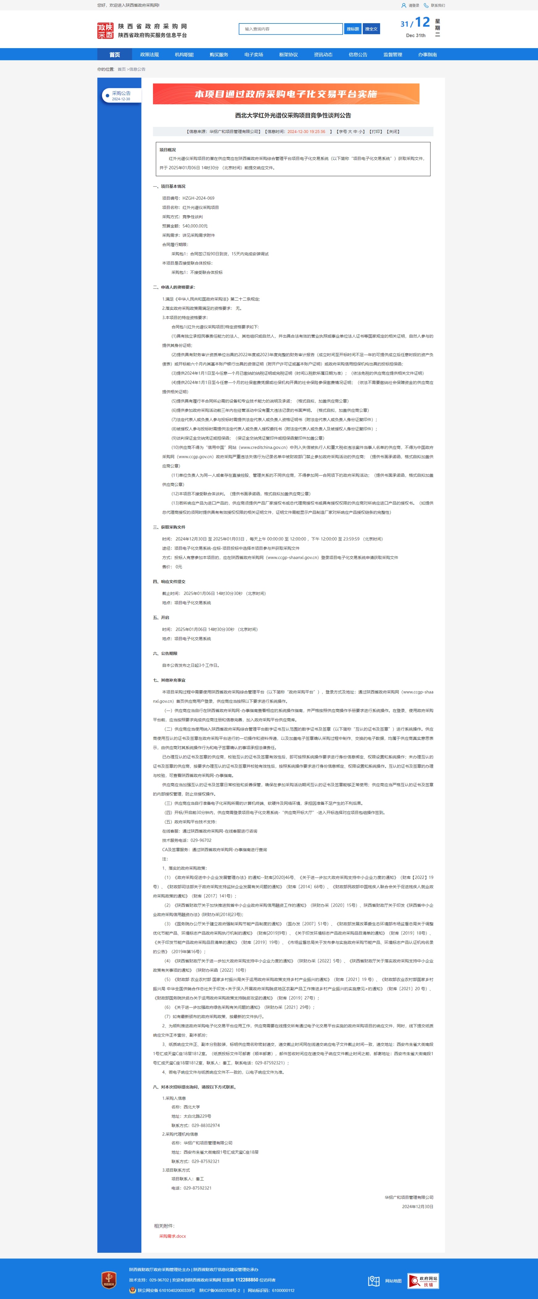开云手机网页版登录入口红外光谱仪采购项目竞争性谈判公告 作者: 编辑:薛利娟 时间:2024-12-31 原公告链接:https://www.ccgp-shaanxi.gov.cn/freecms/site/shaanxi/ggxx/info/2024/8a69c251921857370194174168cb49b9.html?noticeType=001013¬iceId=7e09294d-c6a2-11ef-8063-08c0eb20c666