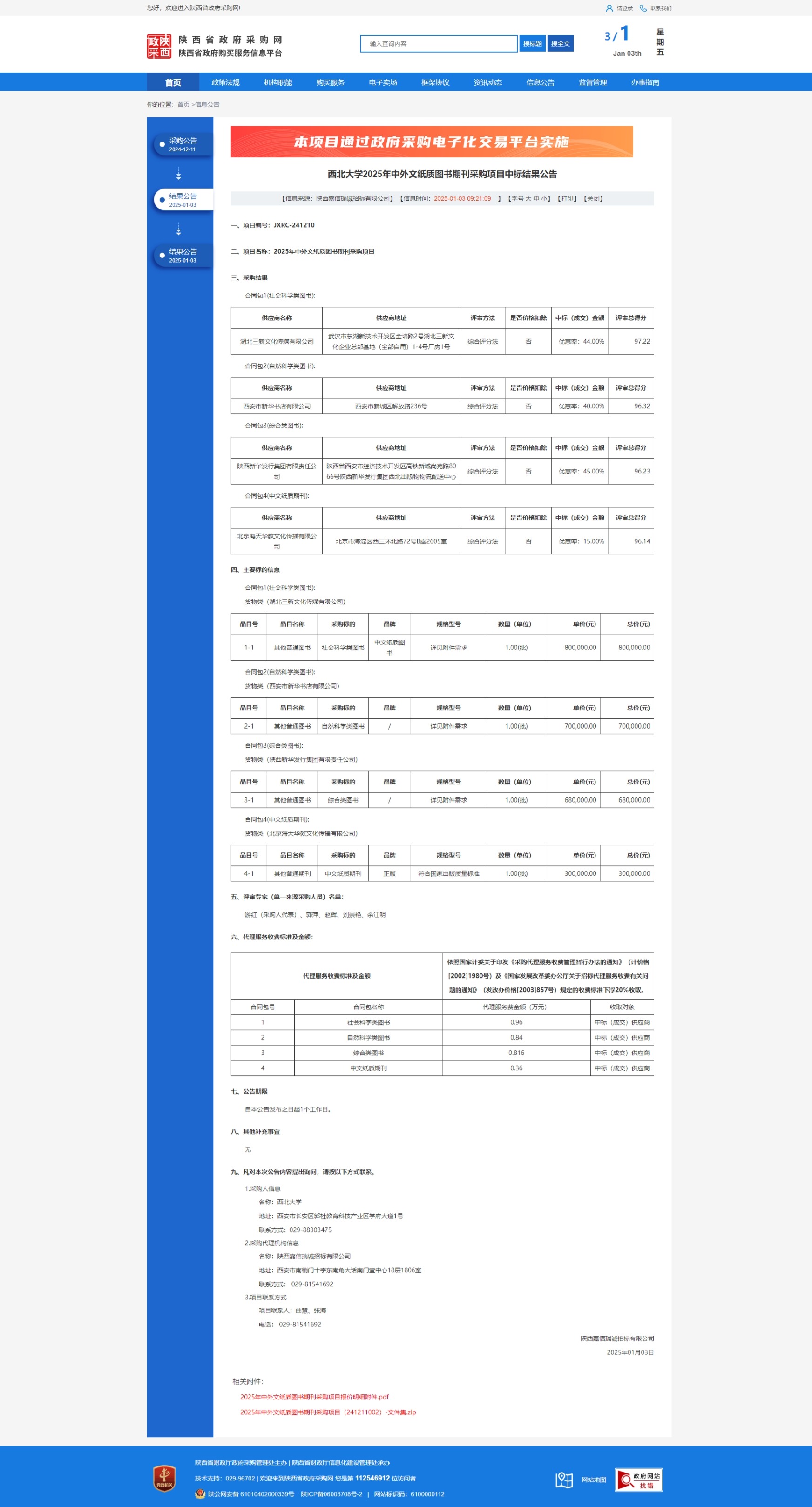 开云手机网页版登录入口2025年中外文纸质图书期刊采购项目中标结果公告 作者: 编辑:薛利娟 时间:2025-01-03 原公告链接:https://www.ccgp-shaanxi.gov.cn/freecms/site/shaanxi/ggxx/info/2025/8a69c95d921859f0019429b635ac1b8f.html?noticeType=001021¬iceId=ac9e64e8-c972-11ef-8063-08c0eb20c666